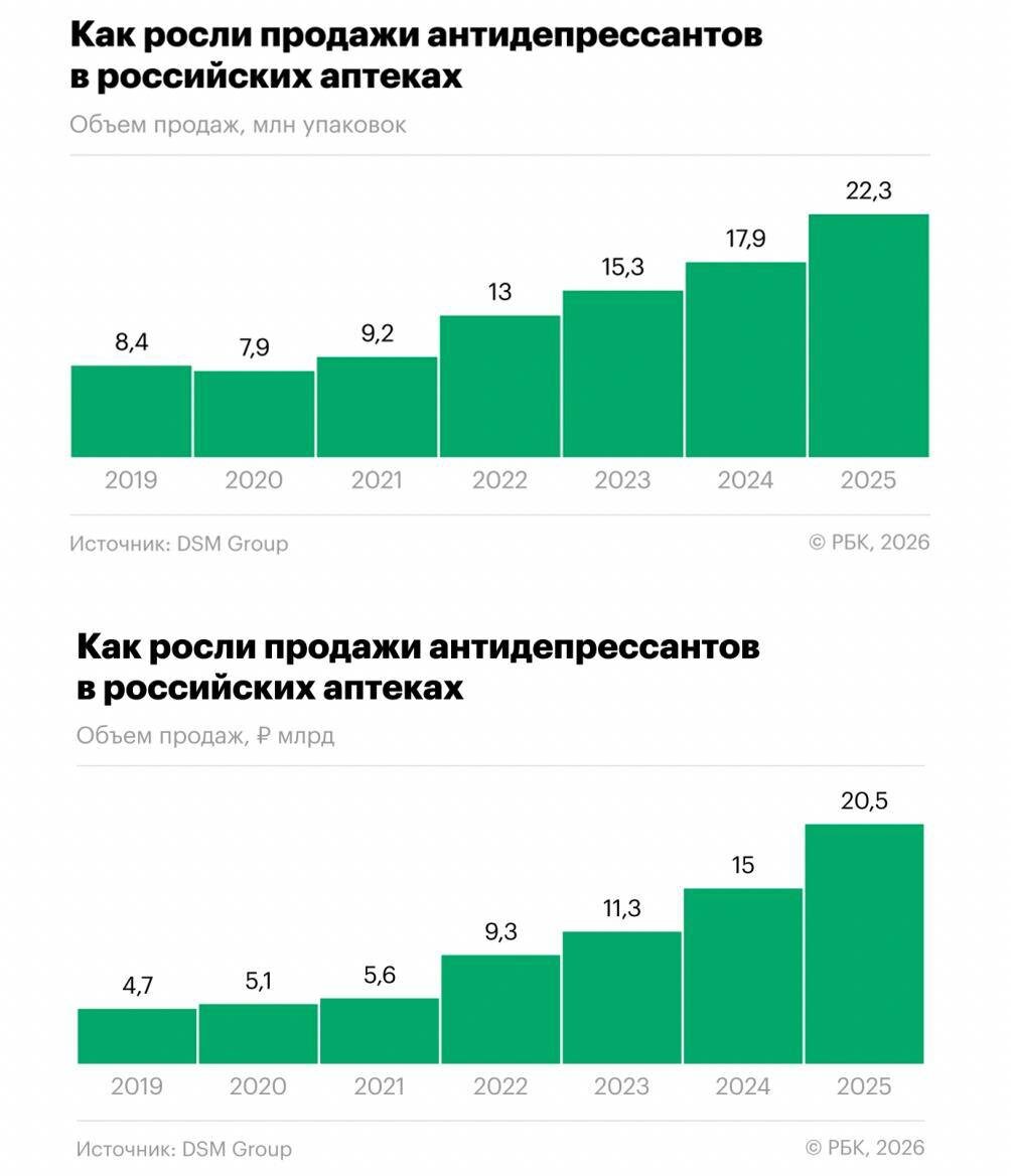 Статистика за 2025 год показывает впечатляющий рост. Аптеки зафиксировали 36%-ное увеличение выручки от продаж антидепрессантов по сравнению с 2024 годом. Это соответствует количественному увеличению на 24% по сравнению с предыдущим годом — более 22,3 миллиона упаковок препаратов этого класса были проданы.