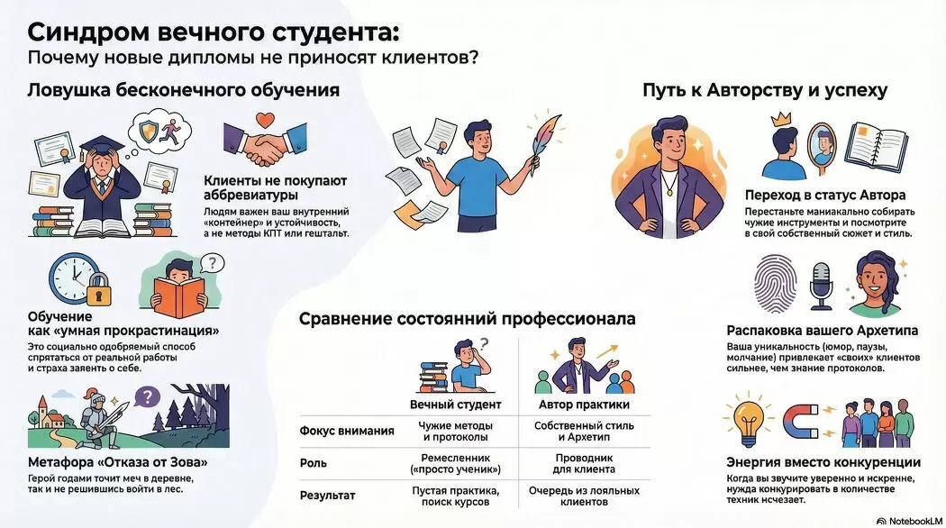Во многих случаях вложение в дорогостоящие курсы становится способом избежать реальной работы. Психологическая Тень подсказывает: «Ты еще не готов, прячься за известными именами». Быть «вечным учеником» — это безопасно и удобно, но такая прокрастинация лишь затягивает время.