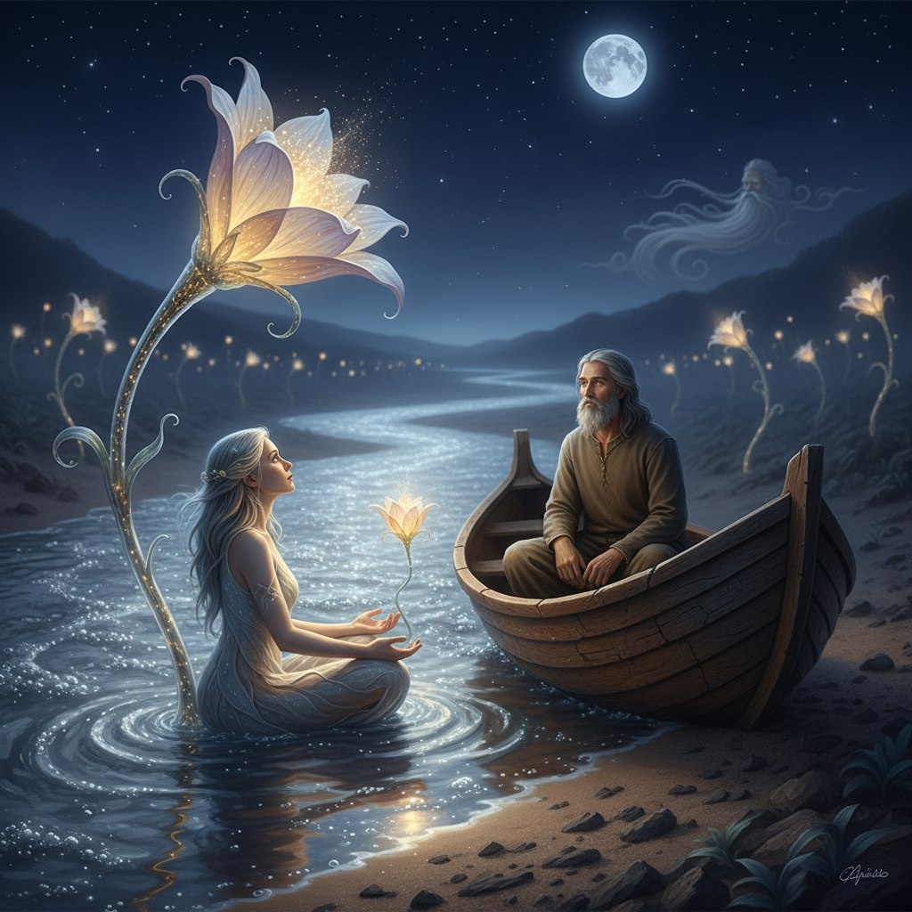 В одной волшебной долине, расположенной на границе двух миров — яви и снов, текла таинственная река. Её вода была насыщена звёздным светом: днём она отражала облака, а ночью впитывала свет далёких звёзд, превращаясь в сияющую жидкость, напоминающую расплавленное серебро.