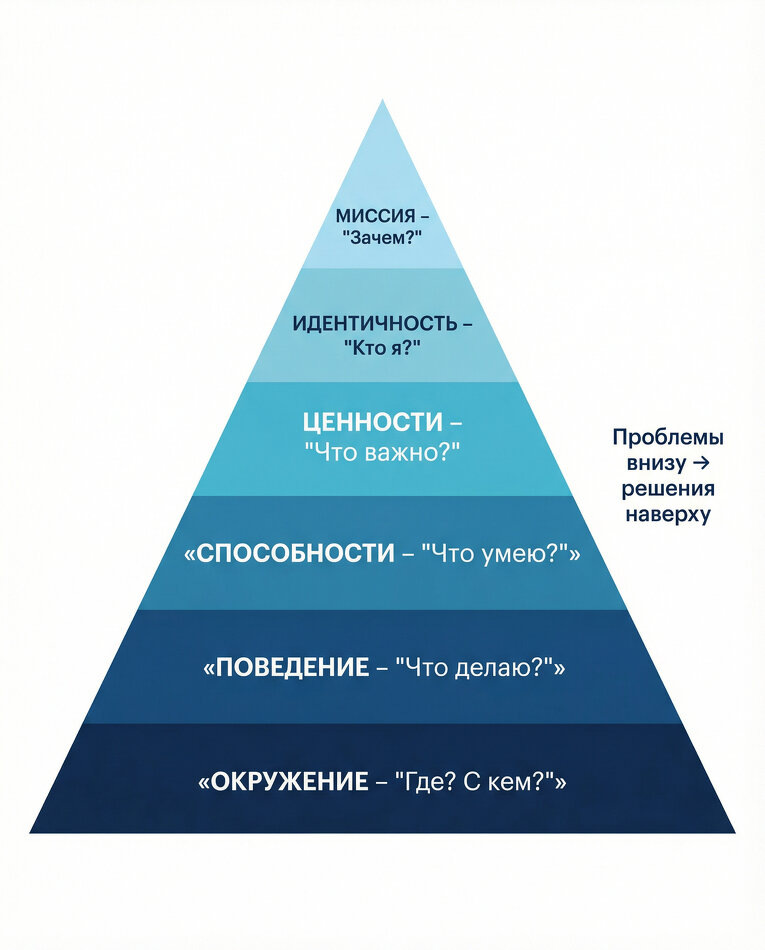 Модель пирамиды Дилтса состоит из шести уровней, которые помогают проанализировать связь между: