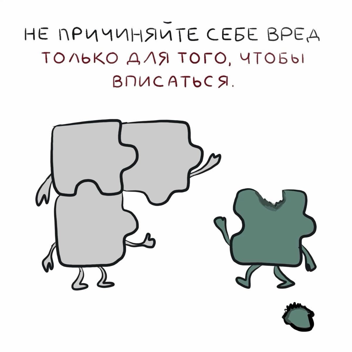 Когда жизнь формируется по указанию других, у человека не остается энергии для творчества и самосовершенствования, так как она ориентирована на цели, которые не резонируют с его внутренним «я». Это приводит к депрессии и ощущению несоответствия, когда подавленная индивидуальность выходит на поверхность, вызывая чувство стыда.