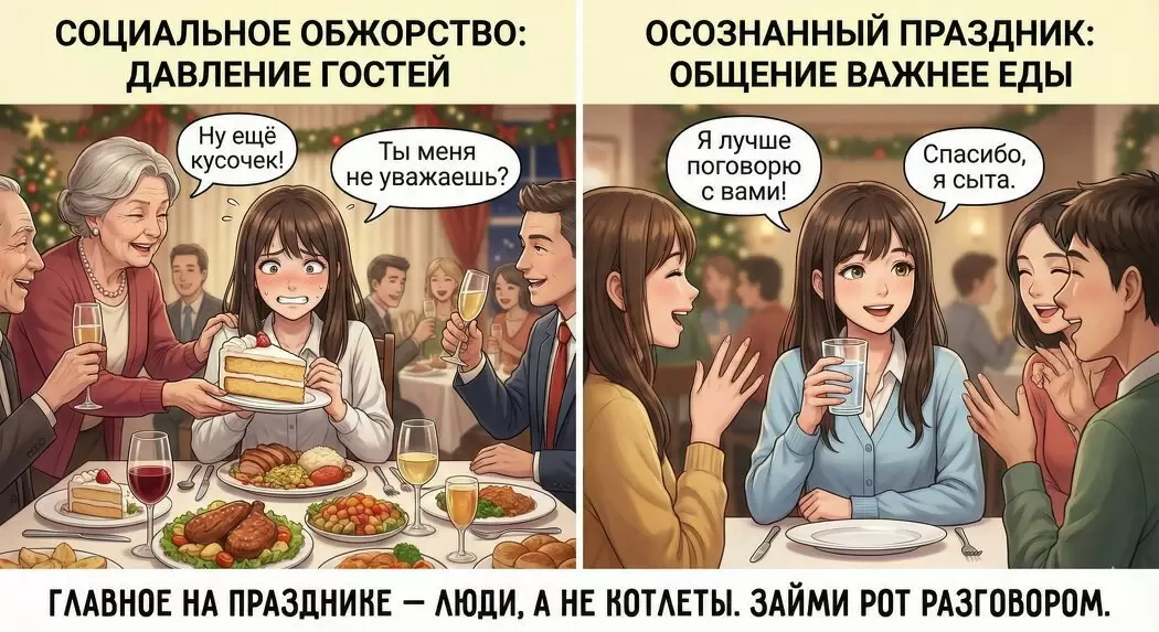 Кажется, вы не голодны, но окружающие активно угощают. Хозяйка, с надеждой в глазах, предOffers третий кусок пирога, а коллеги подбадривают: «Ну, один раз живем!» В итоге приходите домой с чувством тяжести и неотъемлемой виной.