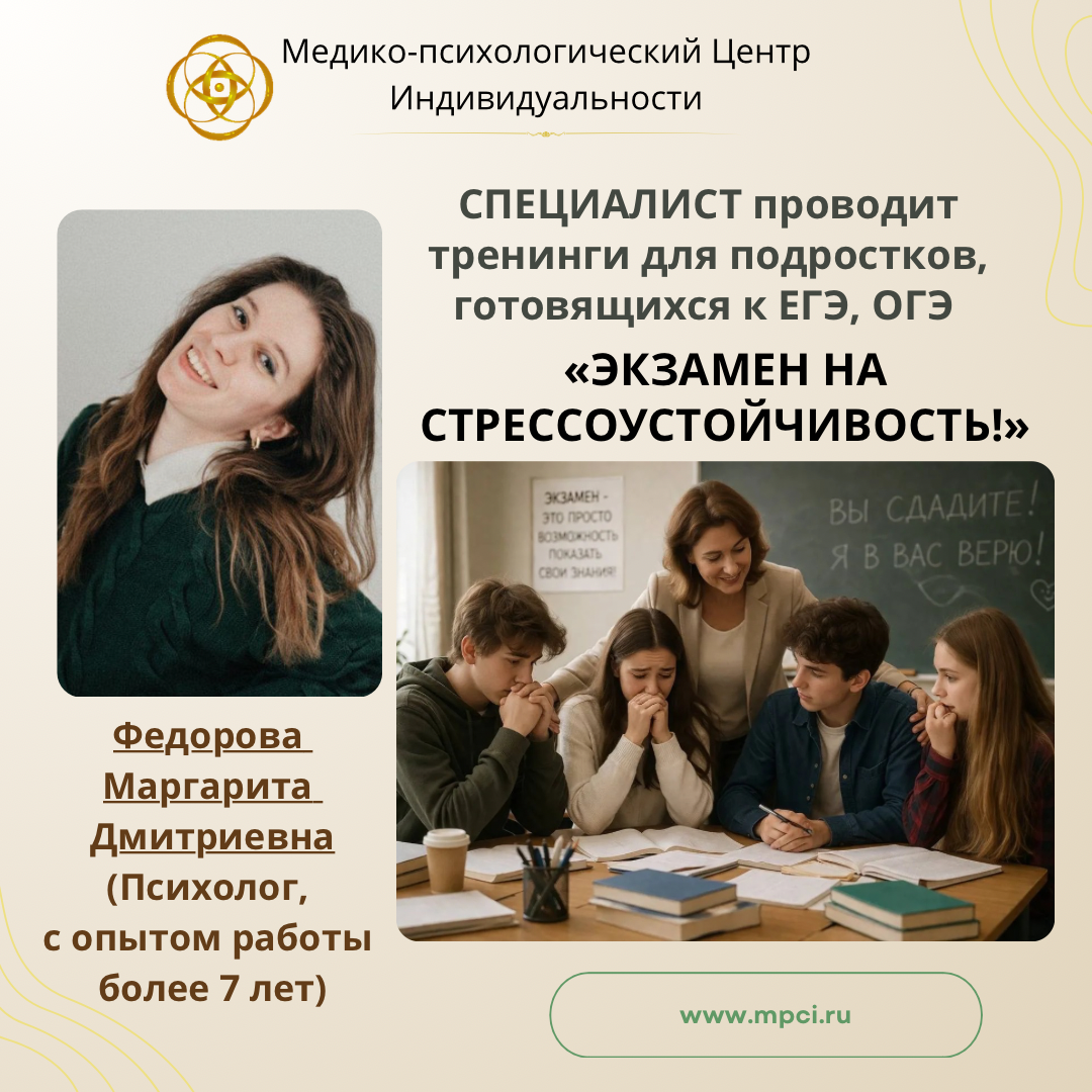 В Центре психологической помощи стартовали занятия с новым специалистом — Маргаритой Дмитриевной Федоровой, психологом с более чем семилетним опытом работы. Она ведет востребованную группу для подростков под названием «Экзамен на стрессоустойчивость», что особенно актуально в период экзаменов.