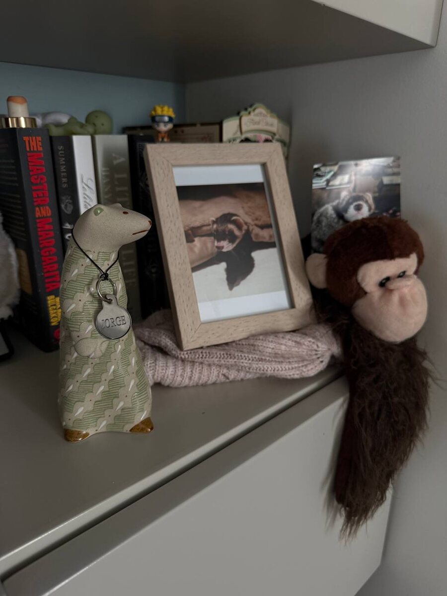 В урне, оформленной в виде фигурки хорька, остались его шапка с привычным запахом и любимая игрушка — обезьянка Лида. Это станет не просто памятью, а символом нашему недолговечному счастью.